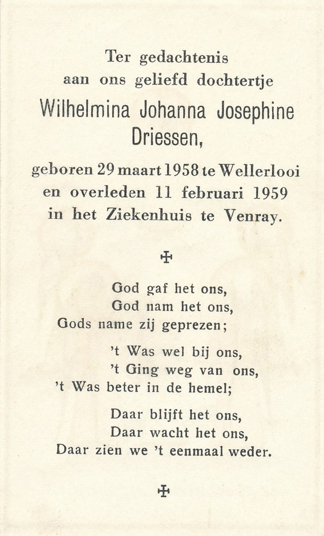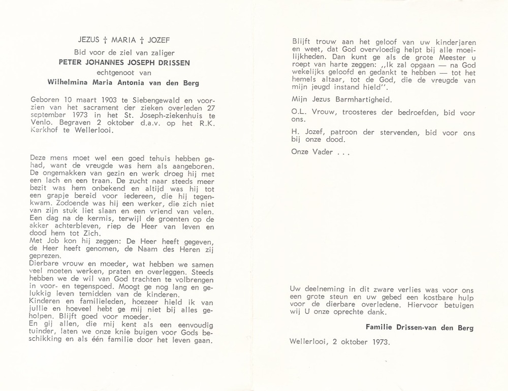 Peter Johannes Joseph Drissen (Janneboer), werd geboren 10-03-1903 in Siebengewald en overleed op 27-09-1973 in het ziekenhuis te Venlo aan nierfalen.