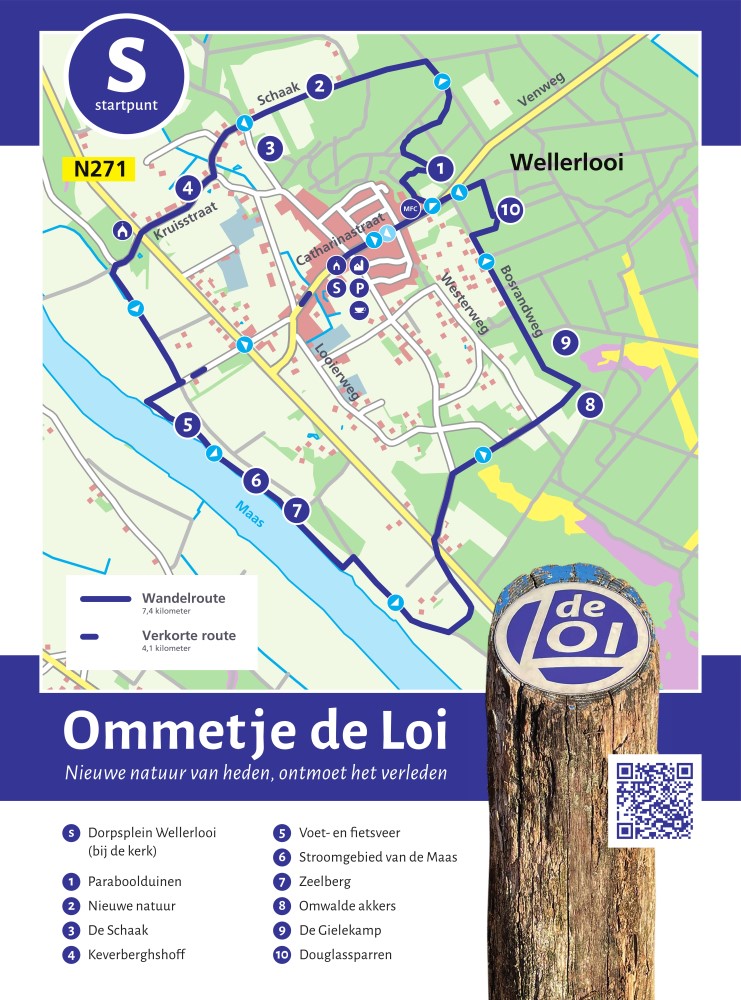 Door een klaphekje volgt u dan een struinpad langs de Maas. Ter hoogte van een ommetje-paaltje in de wei verlaat u weer het stroomgebied van de Maas. Aan de linkerkant ziet u een verhoging in ’t landschap, de Zeelberg. U volgt de route hier weer de Rijksweg over en loopt door de straten Droogstal en Zeelberg. Bij een T-splitsing komt u op de Bosrandweg. Hier gaat u linksaf. Na de eerste bebouwing aan de linkerkant, neemt u het 2e pad rechts (rode wandelroute), aangegeven door een ommetje-de-Loi-paaltje. Hier komt u door een bos met oudere Douglassparren. Het pad komt uit op een half verhard fietspad vanaf de Paaldijk. Hier gaat u linksaf en loopt weer het dorp in, langs ’t Luukske komt u weer uit bij ’t dorpsplein, waar de wandeling begon.