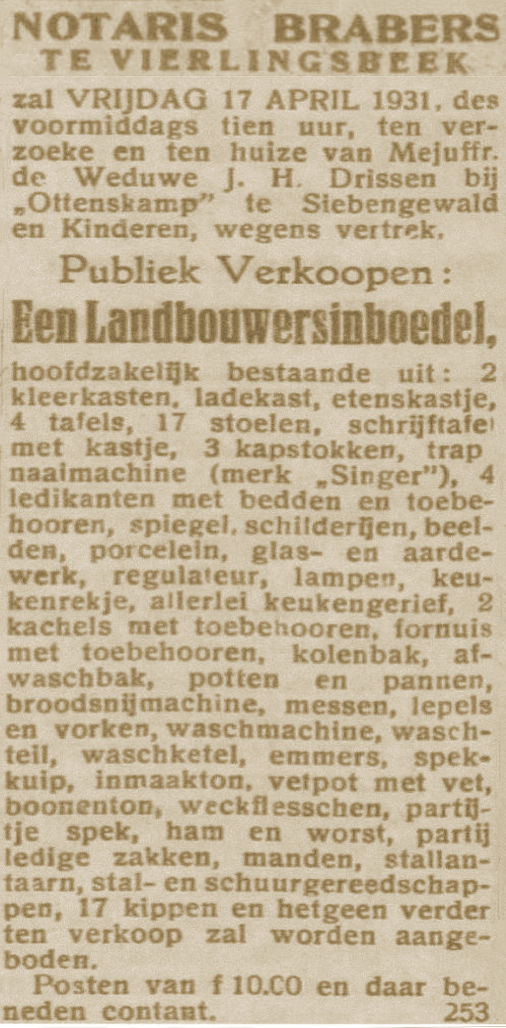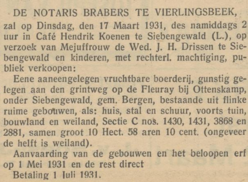 Openbare verkoop boerderij en inboedel boerderij te Siebengewald