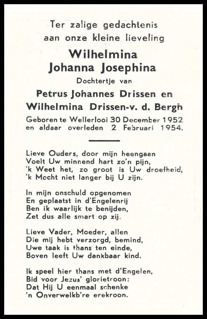 Peter Johannes Joseph Drissen (Janneboer), werd geboren 10-03-1903 in Siebengewald en overleed op 27-09-1973 in het ziekenhuis te Venlo aan nierfalen.